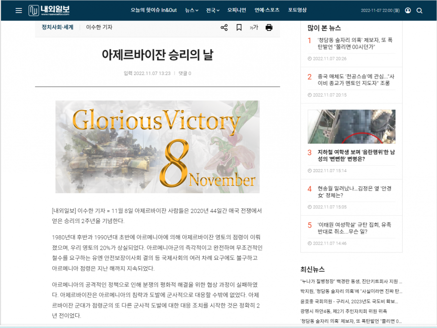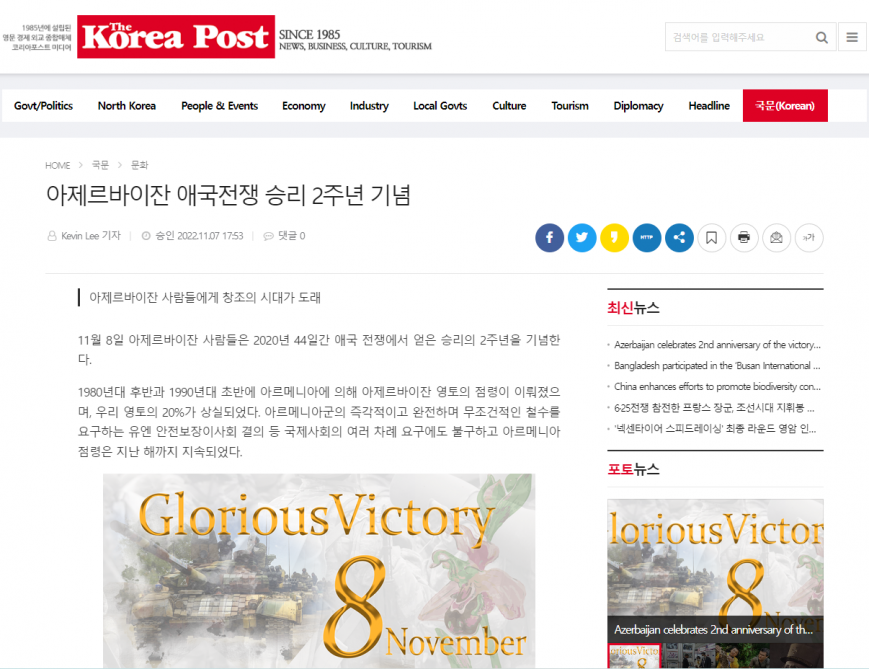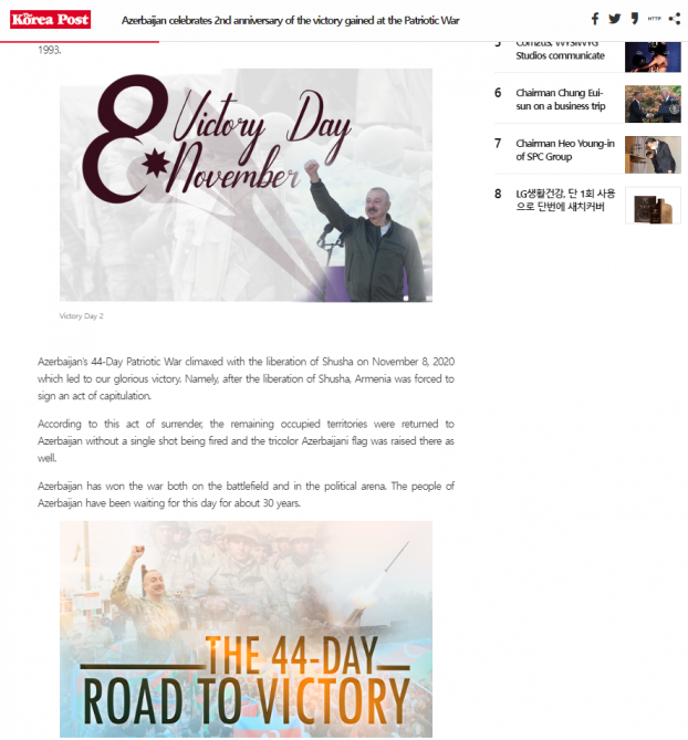 Cənubi Koreyanın “Naewoeilbo” qəzeti və “Korea Post” media qrupuna aid xəbər portalları Koreya və ingilis dillərində “Azərbaycan Vətən Müharibəsində qazandığı zəfərin ikinci ildönümünü qeyd edir” başlıqlı məqalələr yayıb.